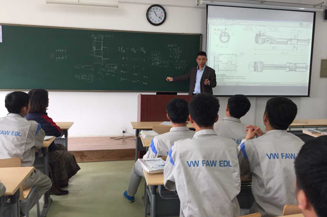 为加快现代制造技术专业群建设,提高办学综合实力,我校于2015年3月12日与大众-一汽发动机(大连)有限公司合作开办了“大发订单班”,让学生以企业准员工身份接受职业教育。2015年5月,“大发订单班”第一阶段的课程已接近尾声,大众-一汽发动机(大连)有限公司人力资源部部长田洁一行三人 ,于2015年5月13日至15日来到学校,采取听课、现场答疑、座谈交流等形式对前一段教学效果进行评估检查 。2015年5月15日下午14点座谈会在机械工程学院511会议室召开。参加会议的有校长助理胡国良、机械工程学院院长魏建军、教务处副处长陆俊松、就业办副主任刘凤珠、任课教师及“订单班”24名学生。会上,企业、学校、学院领导及任课教师与学生进行了交流。
