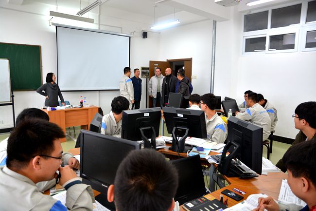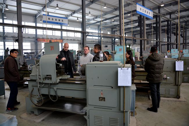 随后,考察团一行参观了我校实训基地。参观过程中,两位德国专家还饶有兴趣的观摩了学生实训作品,并走进数控4年制的德语课堂,与学生用德语进行简单的交流。