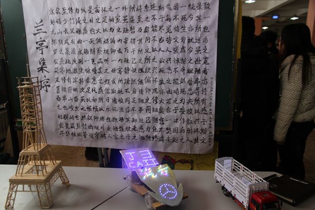 本次参展的书法作品分为书画、手工艺品两大类,每一个展品都有详细的介绍,其中有解放卡车模型、飞机模型、黄铜和铁板制作成得徽章和动物造型工艺品、废旧筷子制作的房屋、废旧塑料袋设计的服装、废旧纸板制作的各种物品、油泥模型等,各具特色,博采众长,诗画作品栩栩如生,用各种废旧品制作的精美手工作品也惟妙惟肖,吸引了众多学校领导、学生前来观看。