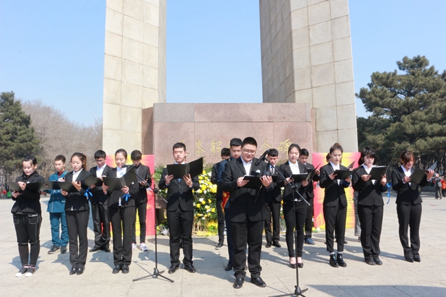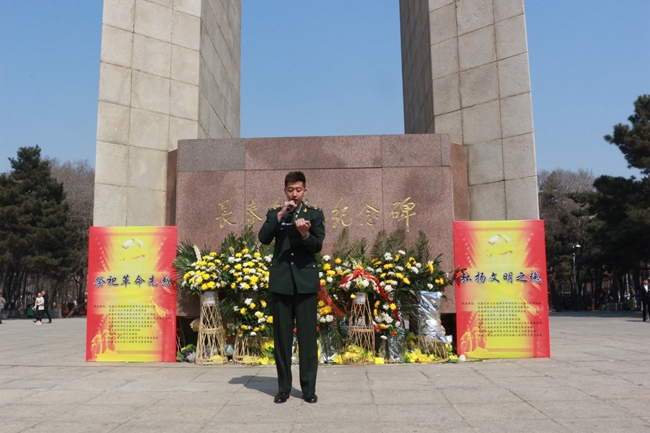 活动开始,志愿者们肃立在南湖公园解放纪念碑前高唱庒严的国歌,由20所高校所组成的献祭词团为革命烈士敬献祭词并擦拭解放纪念碑。接着志愿者代表们排着整齐的队伍依次为革命烈士敬献鲜花并默哀三分钟,表达了对烈士的敬意与怀念。吉林省军区独立营退伍军人崔珈睿发表沉痛哀悼,我校百川志愿者协会和长春市19所高校志愿服务组织共同红歌合唱《国家》并用手语表演《爱的奉献》。活动最后,由高校团委书记代表宣读文明祭祀倡议书,倡导广大市民从现在做起,从我做起,争做传统文化的传承者、中华美德的践行者、文明祭祀的带头人。