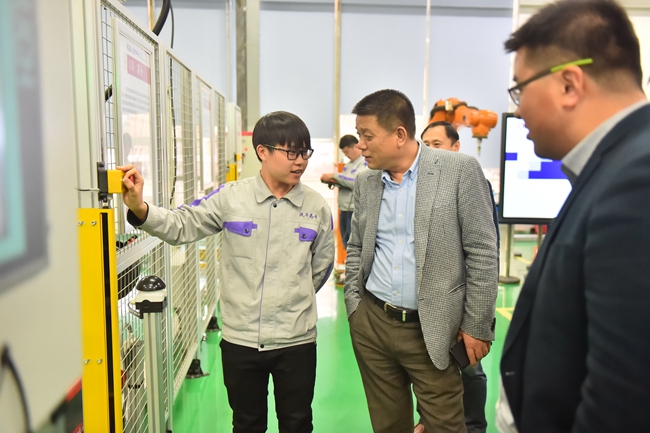 随后专家一行人等参观了我校智能机器人实训中心。在参观过程中不时与实训中心负责人及在现场进行实训操作的学生交流,了解中心建设情况的同时提出建设中存在的问题并给出修改建议。