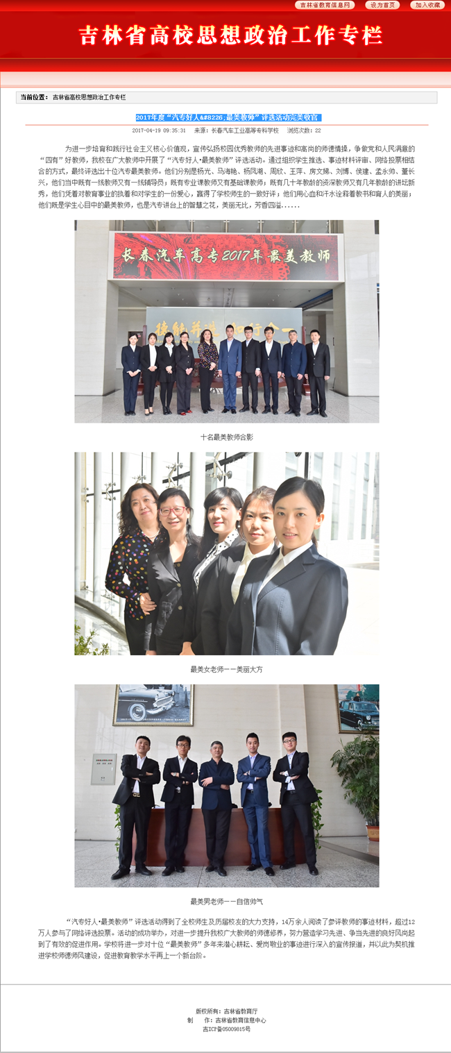 吉林省高校思想政治工作专栏——2017年度“汽专好人;最美教师”评选活动完美收官