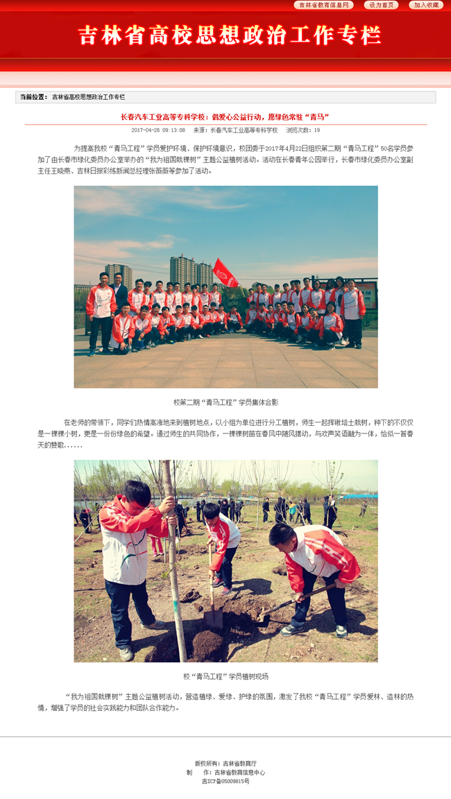 吉林省高校思想政治工作专栏——长春汽车工业高等专科学校:倡爱心公益行动,愿绿色常驻“青马”