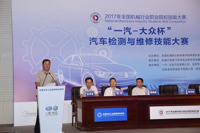 2017年7月17日上午9:00,2017年全国机械行业职业院校技能大赛汽车类专业技能大赛开赛式在长春汽车工业高等专科学校图书馆报告厅隆重举行。长春市教育局副局长张茂金主持开赛式。全国机械职业教育教学指导委员会主任委员、机械工业教育发展中心主任陈晓明,吉林省教育厅职业与成人教育处副处长申守权,一汽-大众销售有限责任公司党委副书记、纪委书记、工会主席曹伟华,长春汽车工业高等专科学校党委书记安军、长春汽车工业高等专科学校校长李春明在主席台上就坐。机械工业教育发展中心职业教育处副处长吕冬明,一汽-大众销售有限责任公司大众品牌售后服务部、服务技术培训部中方部长周文波和德方部长沃尔特•约克,长春汽车工业高等专科学校副校长明晓辉、副校长胡国良、副校长丁卓等领导和嘉宾与来自全国21个省市、自治区、直辖市的158支代表队的领队、指导教师及行业专家、赛事裁判员,行业企业代表共同参加开赛式。40多位媒体记者见证了这一重要时刻。