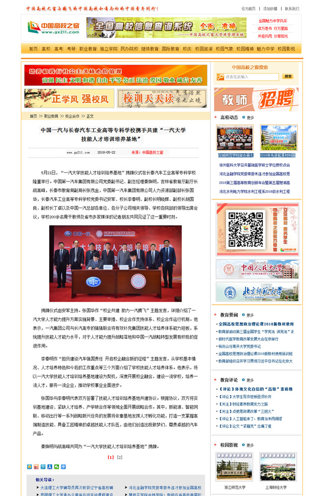中国高校之窗——中国一汽与长春汽车工业高等专科学校携手共建“一汽大学技能人才培训培养基地”