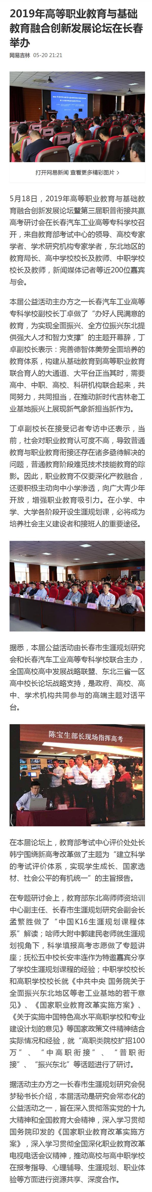 网易吉林——2019年高等职业教育与基础教育融合创新发展论坛在长春举办