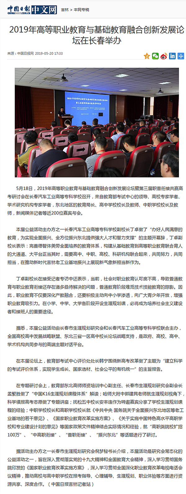 中国日报中文网——2019年高等职业教育与基础教育融合创新发展论坛在长春举办