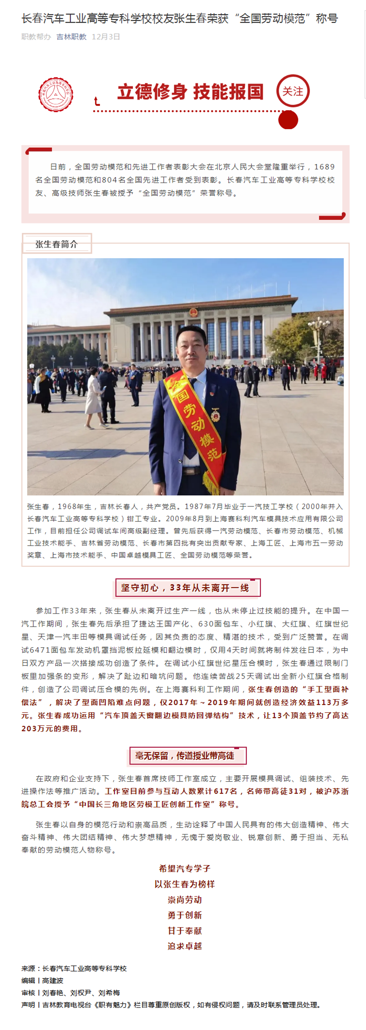 吉林职教——长春汽车工业高等专科学校校友张生春荣获“全国劳动模范”称号