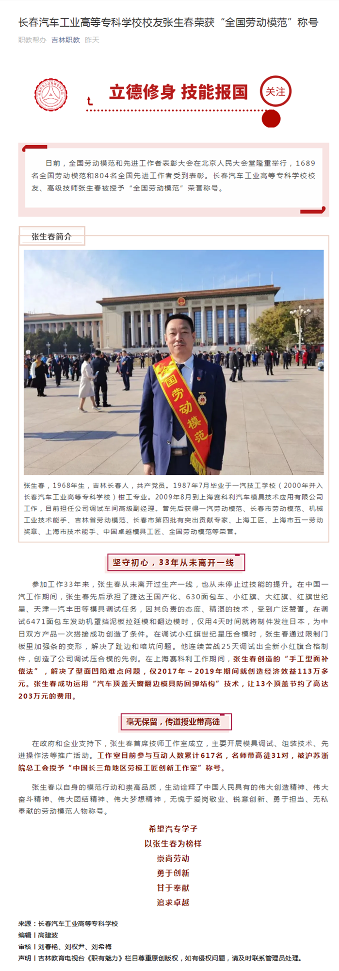 吉林职教——长春汽车工业高等专科学校校友张生春荣获“全国劳动模范”称号