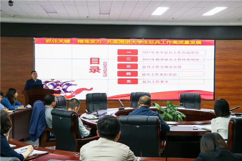 为深入贯彻落实国家“一年两征两退”兵役征集制度改革决策部署,进一步推动我校大学生征兵工作落地落实,5月17日,我校在图书馆505会议室召开2021年征兵工作部署会议,标志着我校2021年秋季大学生征兵工作全面启动。学生处处长程明、处长助理缪树启、各院部学工队伍参加会议。会议由缪树启主持。