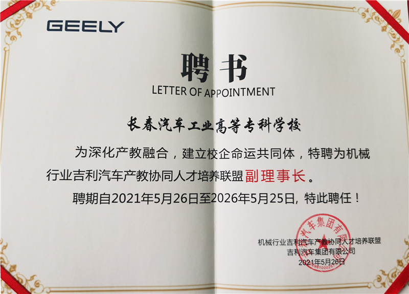 机械行业吉利汽车产教协同人才培养联盟副理事长单位聘书