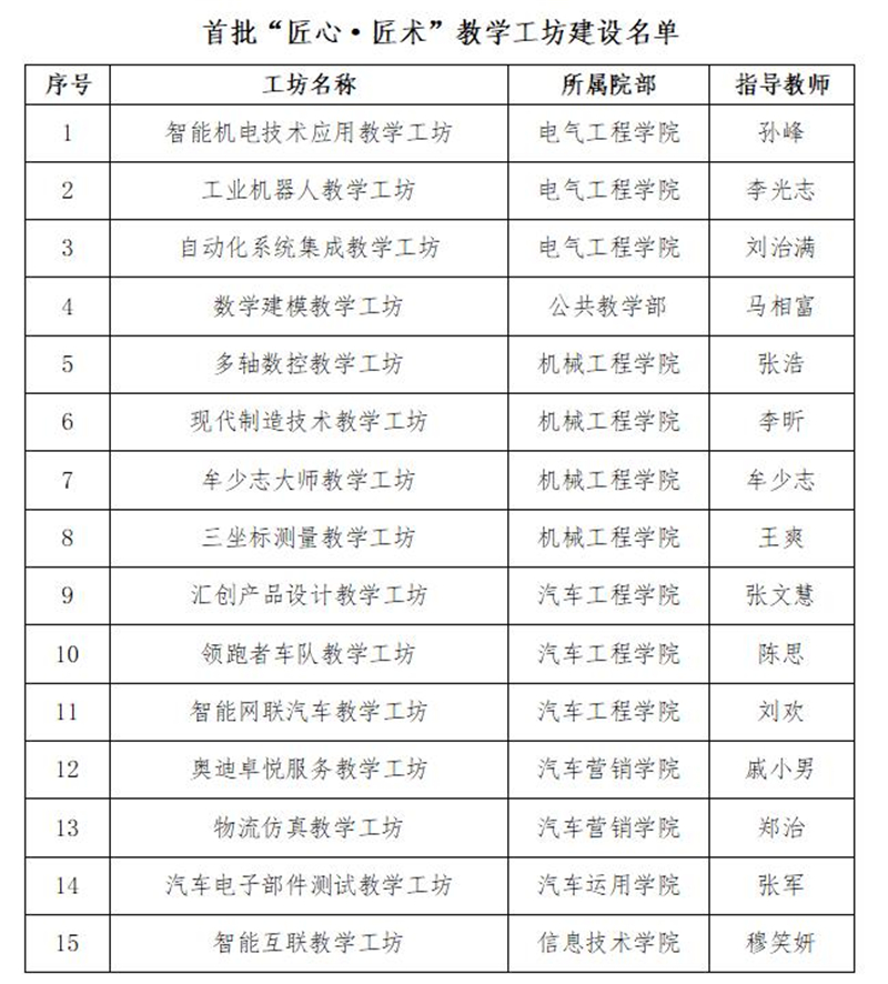 经过各院部的精心准备和两轮遴选,学校基于现有建设基础、学校发展规划、课程设计思路、学生覆盖范围、教学改革引领等方面的综合考量,遴选出15个首批“匠心·匠术”教学工坊,具体名单如下:
