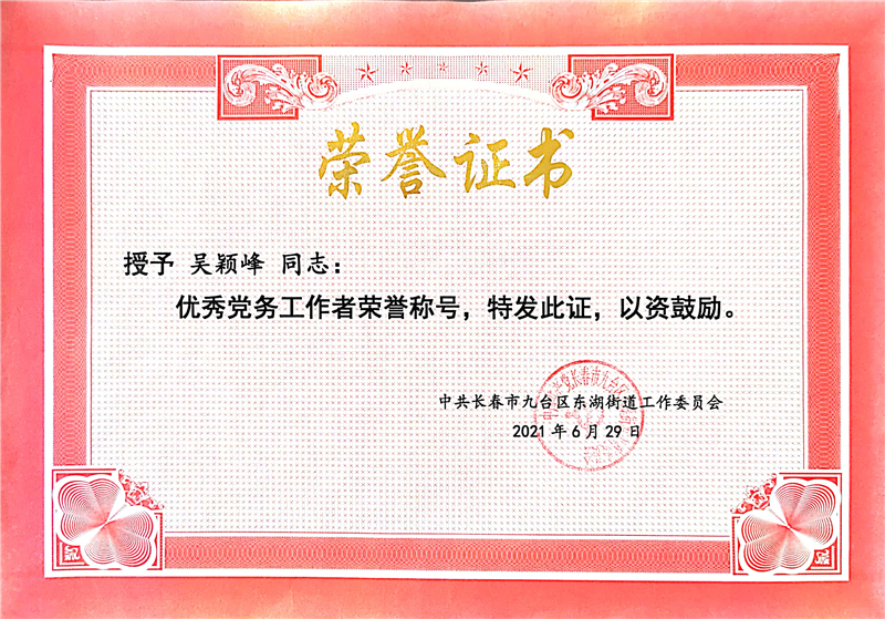 我校“双促双派”驻村干部吴颖锋同志荣获中共长春市九台区东湖街道优秀党务工作者荣誉称号。
