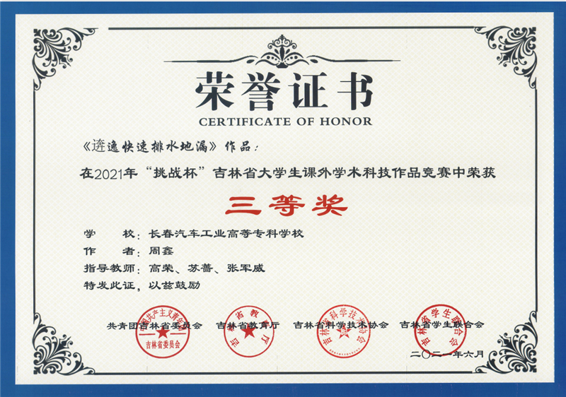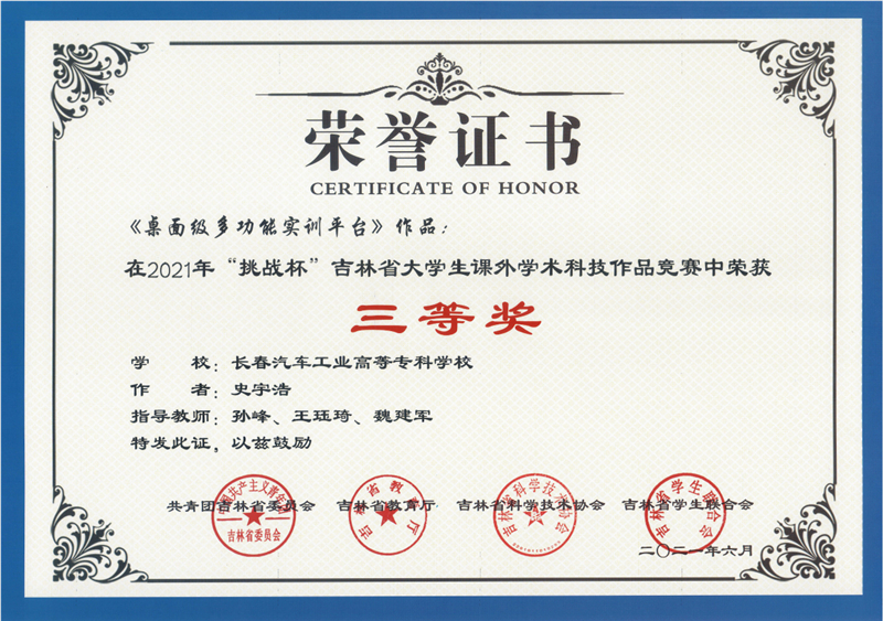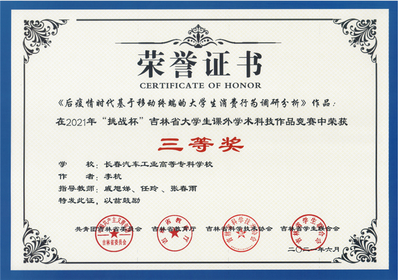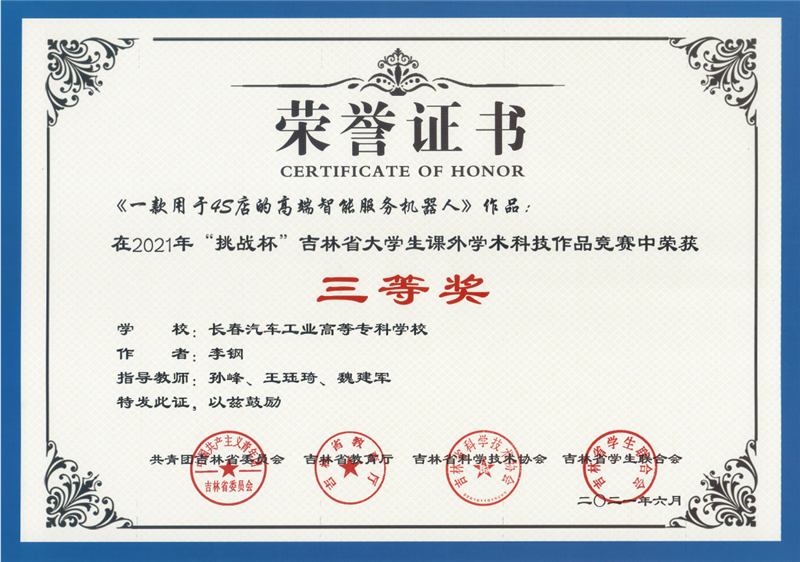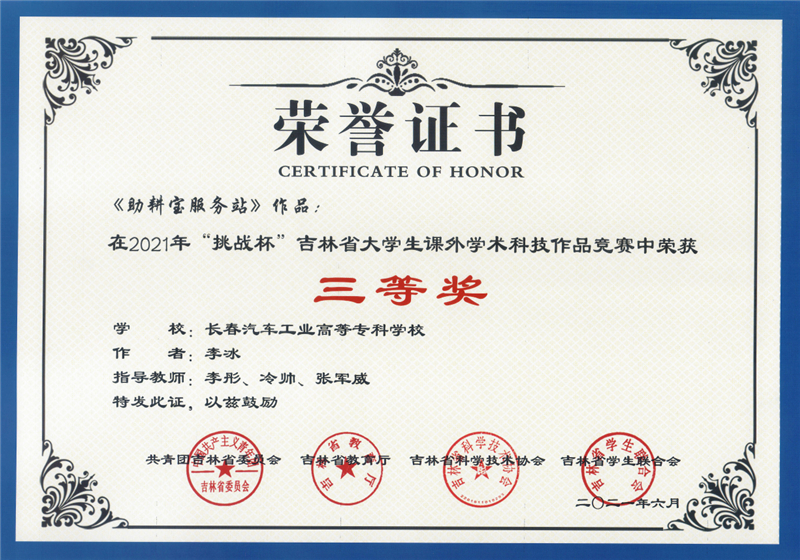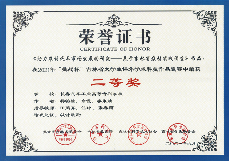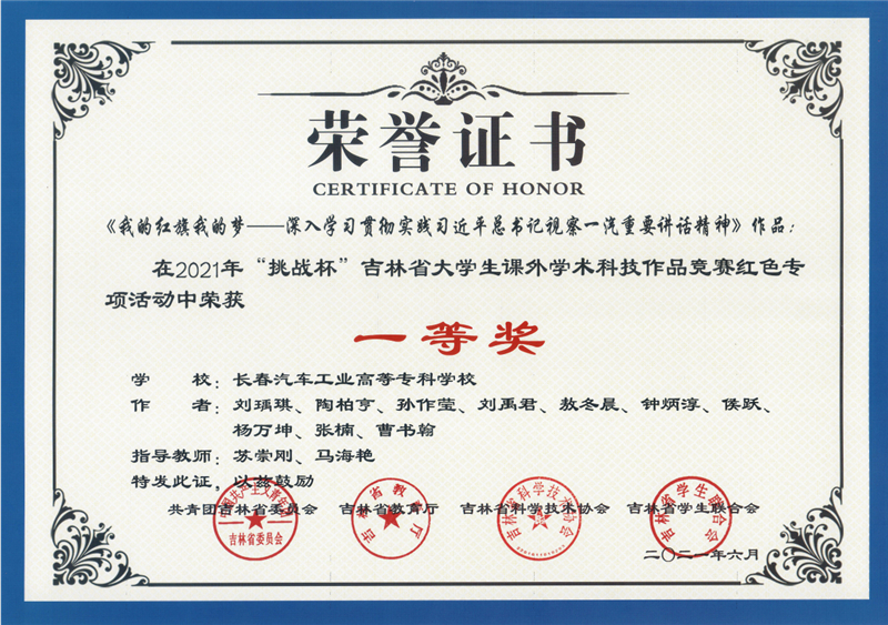 2021年“挑战杯”竞赛得到了学校领导及各部门的高度重视,经过校内评选,最终报送优秀作品12件参加省赛。最终,《我的红旗我的梦——深入学习贯彻实践习近平总书记视察一汽重要讲话精神》获得红色专项一等奖;《助力农村汽车市场发展的研究——基于吉林省农村实践调查》获得二等奖;《一款用于4s店的高端智能服务机器人》、《桌面级多功能实训平台》、《助耕宝服务站》、《逩逸快速排水地漏》、《后疫情时代基于移动终端的大学生消费行为调研分析》获得三等奖。