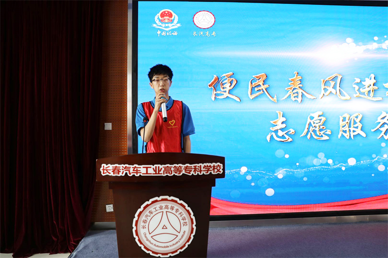 志愿者代表姜展浩在发言中表示,将秉承志愿服务精神,以导税、宣传、辅导为基点,在理论与实践中成长自己,向社会展现汽专学子的青春力量。
