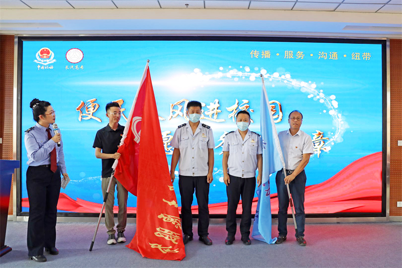 在随后的授旗仪式环节上,卢大伟副处长和崔继先副主任分别授予志愿者代表“长春税务志愿者”“税收春风万里行”两面旗帜,希望志愿者无私奉献,勇担重任,将税收政策传递进校园、企业和家乡,产生“一个孩子影响一个家庭,一个班级带动一个社会”的宣传辐射效益。