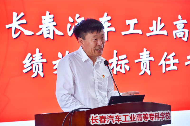 李春明在发言中指出,学校恰逢向高水平、高速度发展全力迈进的关键时刻,管理模式的转变意义重大。责任书的签订就是使命的传达,目的是全面梳理和优化我校的教育服务观、学生发展观、运行机制与运行方式,要从原来的经验引领向战略引领做出根本性转变。通过自定目标、自我诊断、自我激励,不断追求卓越,激发学校内动力,把教育教学持续改进和质量优化从纸上转化为全体教职工的自觉行动,最终形成有汽专特色的质量文化。