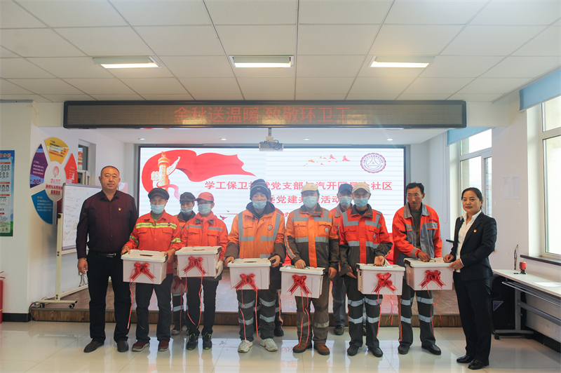 签约仪式后,学工保卫招就党支部根据需求,为环卫工人代表发放了棉手套、帽子、口罩等慰问品。