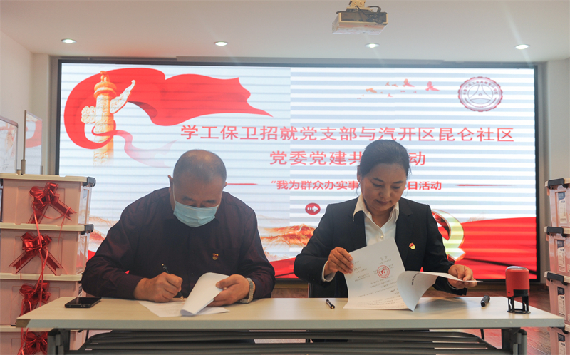 为推动“我为群众办实事”实践活动取得新进展新成效,10月26日上午,学工保卫招就党支部与昆仑社区党委开展共建协议签约仪式暨“我为群众办实事”主题党日活动。昆仑社区党委书记代国艳、学工保卫招就党支部全体党员及30名社区环卫工人参加了本次活动。