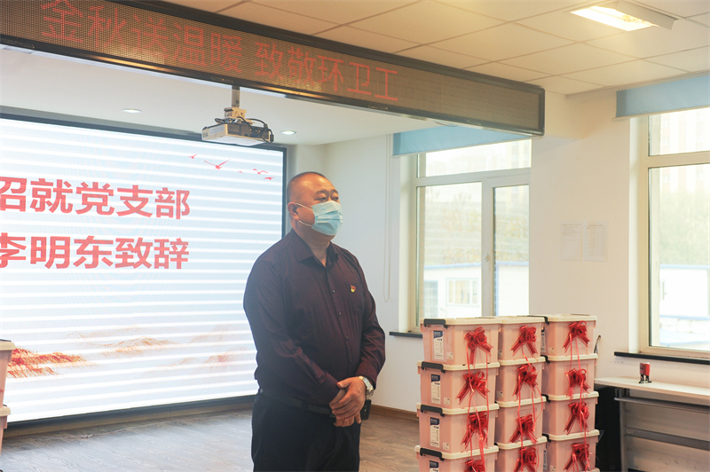 当天正值“环卫工人节”,李明东代表学工保卫招党支部全体党员向在座的环卫工人代表致以节日的问候,对他们为城市环境作出的贡献致以崇高的敬意。