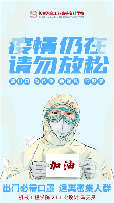 近期,机械工程学院2021级工业设计班全体同学在田和雨老师的《二维设计基础》课程中,以“我为抗疫献一份力”为主题,结合线上课程实践,创作了一系列防疫宣传海报,师生之间通过互联网直播课堂展开了积极乐观的网络课堂抗疫作品创作活动。
