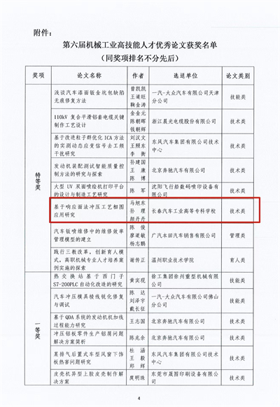 近日,由机械工业职业技能鉴定指导中心组织开展的第六届机械工业高技能人才优秀论文征集评选活动落下帷幕。经行业专家委员会评审,我校机械工程学院模具设计与制造团队两项论文成果脱颖而出,由马旭东老师撰写的《基于响应面法冲压工艺相图应用研究》荣获特等奖,由潘远安老师撰写的《基于短工序的发动机罩外板翻边退件方式浅析》荣获一等奖。马旭东老师荣获“机械工业技术标兵”荣誉称号,我校喜获“机械工业高技能人才培养工作示范单位”荣誉称号。