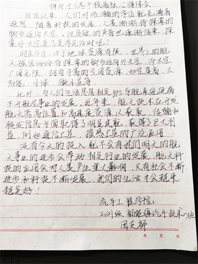 通过此次观看,激发了学生探索宇宙的梦想,树立投身祖国科技事业的远大志向,进一步增强了学生的爱国热情和祖国荣誉感、自豪感。同学们纷纷表示,将以本次观看直播为契机,将“航天精神”落实到行动中,努力学习,为实现中华民族伟大复兴的中国梦贡献自己的一份力量。