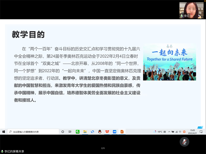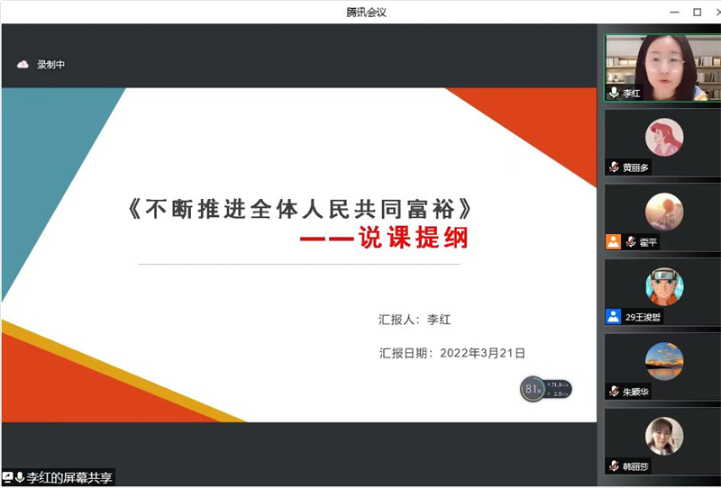 会议中,本学期形势与政策课程专题设计人霍平教授对《不忘百年奋斗史 阔步新的赶考路》专题教学进行示范讲授,将百年党史与七十周年校庆相结合,进行了深入浅出的讲解。李红副教授对《不断推进全体人民共同富裕》、《乘冬奥之风 展中国智慧》专题进行说课,阐述了课程设计理念及教学方法等。