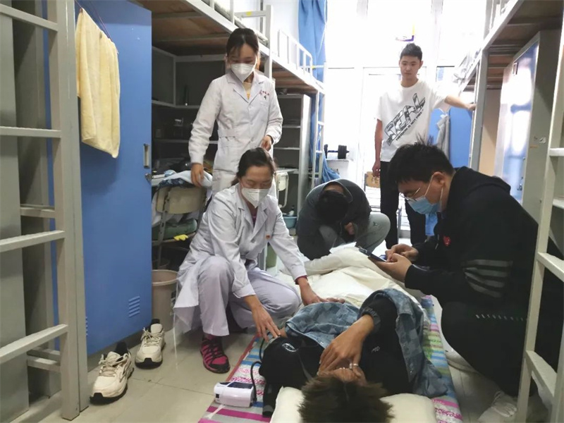 校卫生所护士长宋晓荣是一名退伍军人,也是一名共产党员。疫情防控期间,宋晓荣负责医疗救治和应急救护保障工作,她与新到岗的90后医生高亚玲一同面对超大负荷的工作量,经常不分昼夜连轴转。无数个夜晚,急诊电话响起,她们不顾夜间冷风穿透身体,拎着沉重的急救器材跑步前行,争分夺秒奔赴一线。封校以来,仅出急夜诊就达17次,急救处置过程做到了精准判断,处置得当,严格执行疫情防控流程,保证了学生及时转运就医,用实际行动守护了学生的健康平安