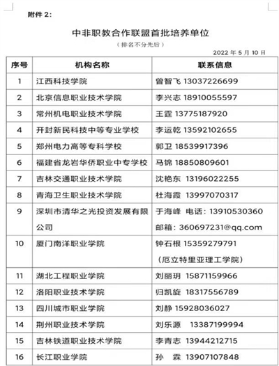 据了解,中非职教合作联盟由中华职业教育社、中国民间组织国际交流促进会及海外交流合作委员会联合组建,旨在进一步深化与非洲国家在职业教育方面的交流合作,为有意愿开展中非交流合作的学校、企事业单位、各机构组织提供支持与帮助。我校加入中非职业教育合作联盟,积极践行中非友好协作理念,将充分发挥自身独特的专业优势,深化产教融合,创新技能型人才培养模式,探寻职业教育发展新途径。