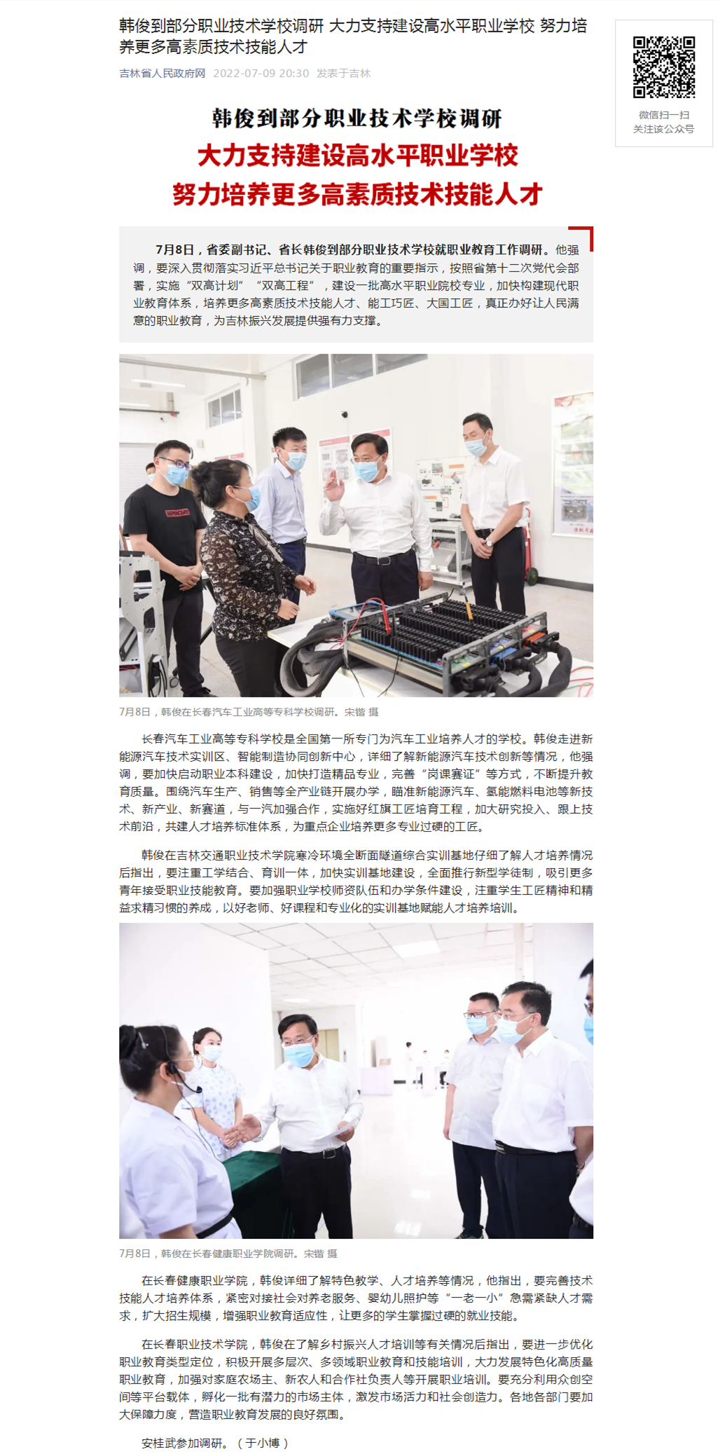 吉林省人民政府——韩俊到部分职业技术学校调研 大力支持建设高水平职业学校 努力培养更多高素质技术技能人才