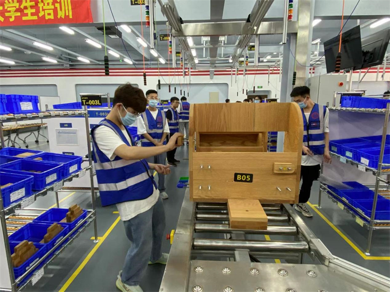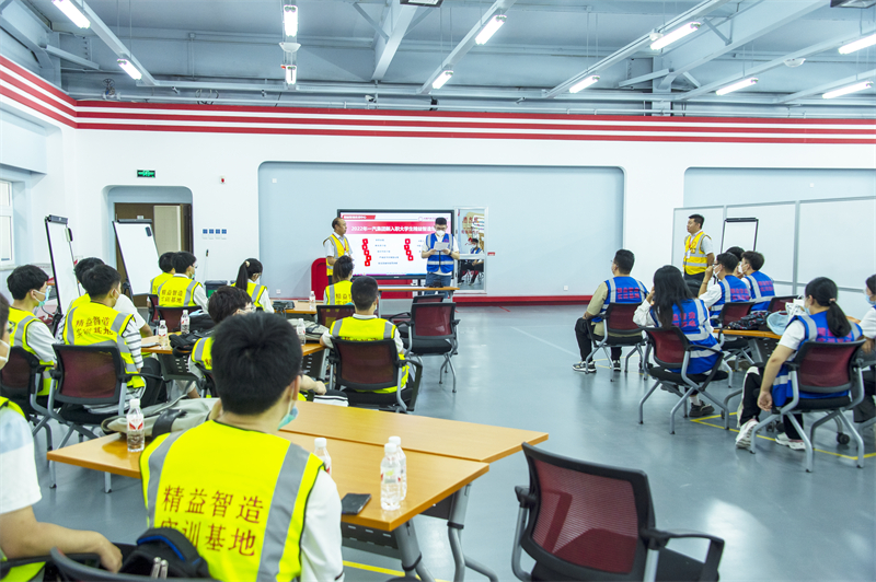 在“精益智造”体验项目中,学员们依托总装模拟生产线,开展了标准作业、目视管理、质量管理与现场改善等项目体验。大家了解了汽车混线装配的复杂性,感受到了标准作业与安灯系统的优势。在分享环节,学员们就精益生产、标准作业与现场改善与刘福军教授进行了观点分享。