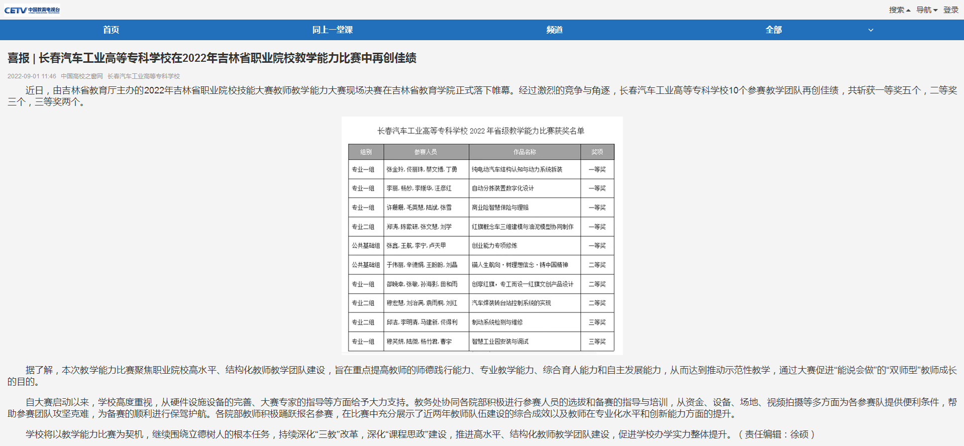 中国教育电视台——喜报 | 长春汽车工业高等专科学校在2022年吉林省职业院校教学能力比赛中再创佳绩