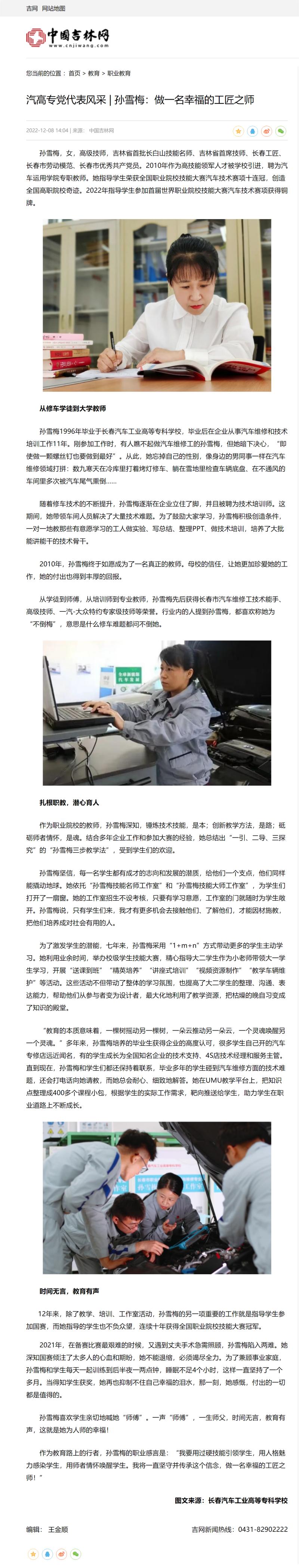 中国吉林网——汽高专党代表风采 | 孙雪梅:做一名幸福的工匠之师