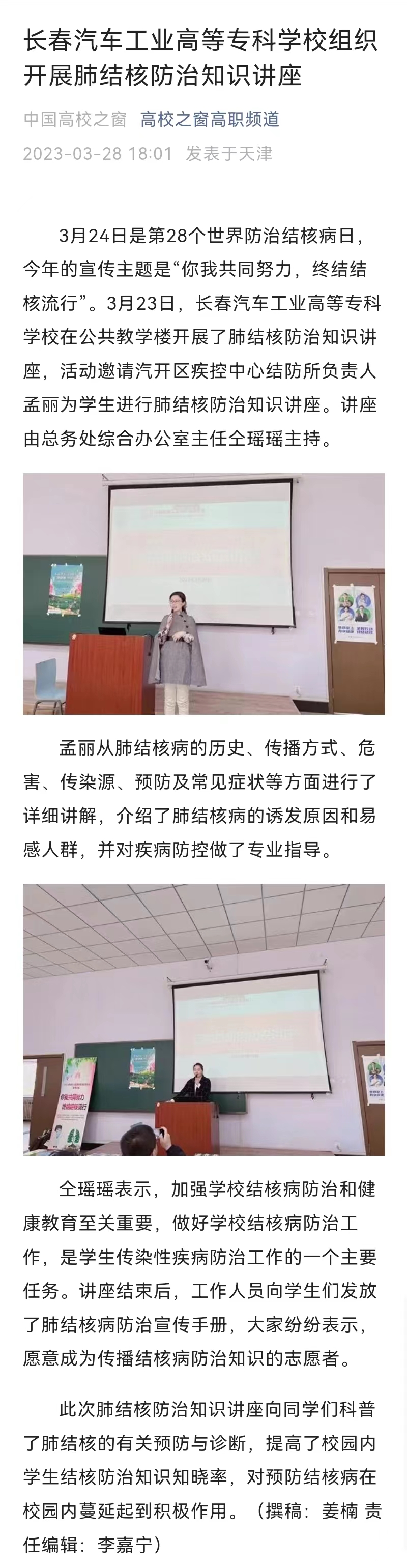 中国高校之窗——长春汽车工业高等专科学校组织开展肺结核防治知识讲座