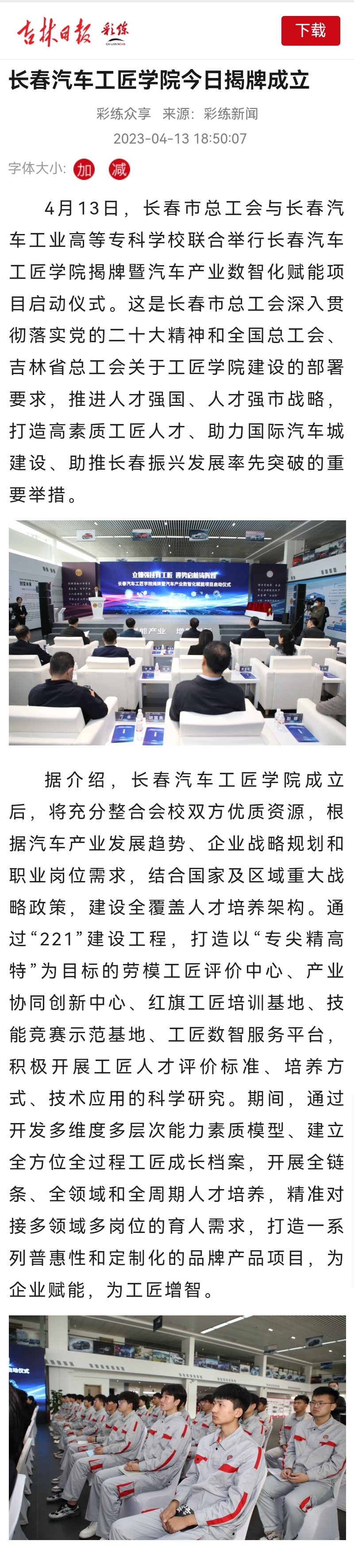 吉林日报——长春汽车工匠学院今日揭牌成立