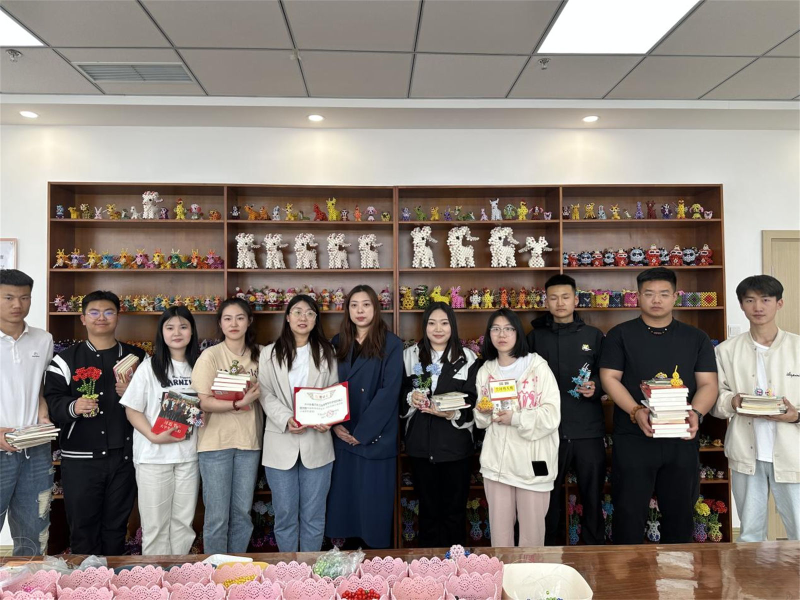 在工作人员的带领下,师生来到手工编织室,参观由聋哑老人手工编织而成的工艺品,并为福利院捐赠书籍。在老人们的耐心教导下,大家共同参与制作完成了多幅编织作品。