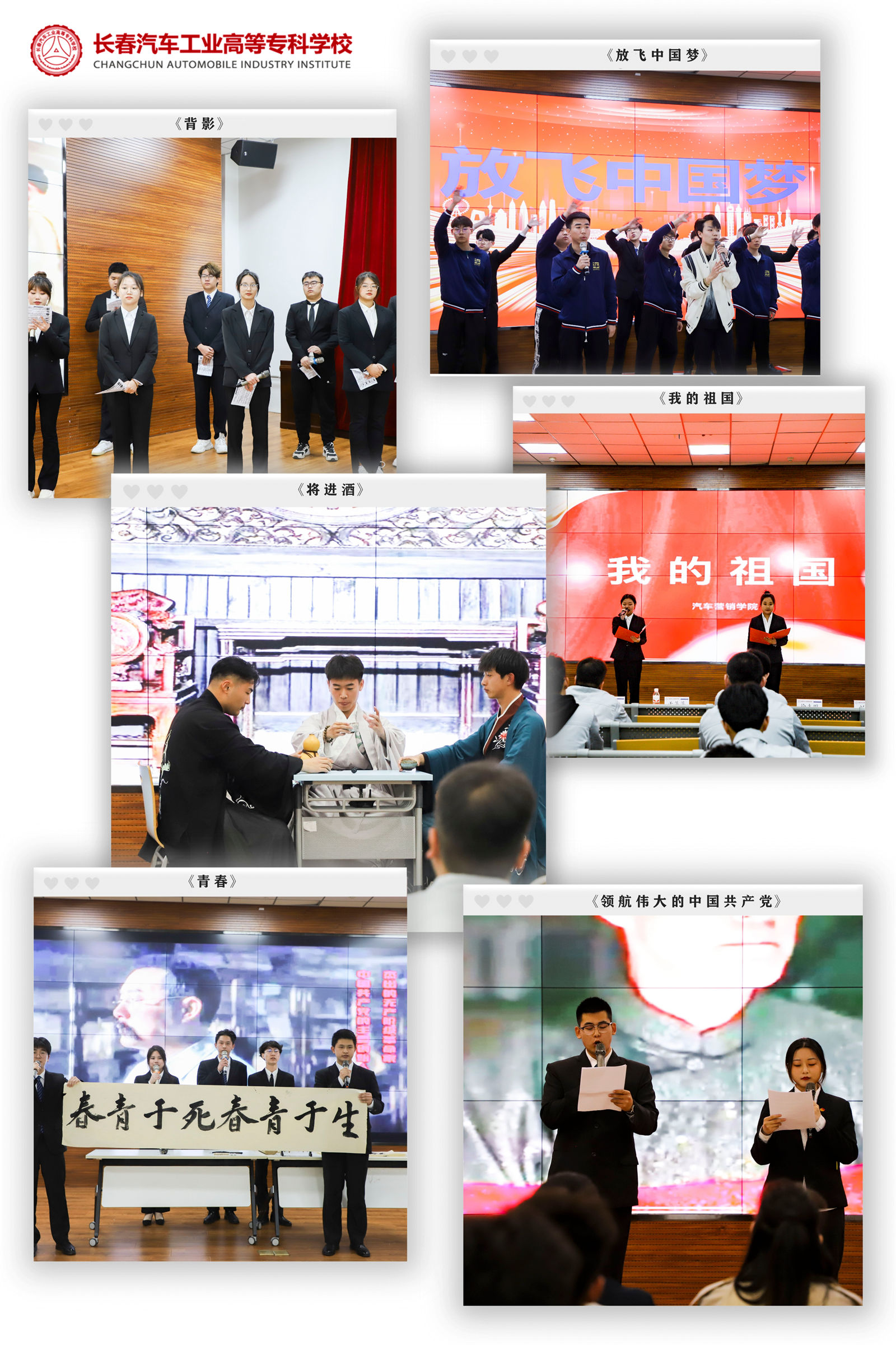 为深入学习贯彻党的二十大精神,倡导学生在经典阅读中增强政治素质、提升道德水平、丰富精神世界,4月27日,由校团委、党委宣传统战部主办,汽车工程学院承办的“享书香雅韵,让信仰扎根”主题读书分享会正式启动。学生处思政科科长刘通、党委宣传统战部教师于蓬蓬、汽车工程学院党总支副书记马海艳、各院团总支书记参加此次分享会,分享会由汽车工程学院辅导员孙方俊主持。 从石悦的《明朝那些事儿》到余秋雨的《文化苦旅》,从余华的《活着》到中共中央党校出版社编著的采访实录《习近平的七年知青岁月》……本次读书分享会推荐书目涉及题材广泛,内容形式多样,既有传统意义上的文学作品,又涵盖了历史、哲学等领域的专著。 同学们满怀激情走上讲台,结合自身阅读的书籍畅谈所学、所思、所得,传递书香正能量。每位同学做完图书分享后,都衔接了各学院的节目表演,分享会现场气氛热烈。机械工程学院的诗朗诵《领航——伟大的中国共产党》,展现了国家从开天辟地到改天换地的峥嵘历程;汽车运用学院的舞台剧《青春》,告诉观众虽然每个人的青春不尽相同,但有志向的人永远自信自强;信息技术学院的故事剧《背影》用深刻细腻的文字展现出了父亲对儿子的爱;汽车工程学院的舞台剧《将进酒》,巧妙还原了当年狂放不羁的李太白造就的诗意中国;汽车营销学院的诗朗诵《我的祖国》点明了要把国家荣誉做为自己毕生的信仰;电气工程学院的诗朗诵《放飞中国梦》,阐释了“中国梦”的伟大。 会后,参加活动的同学们纷纷表示,作为新时代大学生要通过读书学习做有理想、敢担当、能吃苦、肯奋斗的新时代好青年,让青春之花在尽情绽放。 撰稿:汽车工程学院 孙方俊 审编:党委宣传统战部