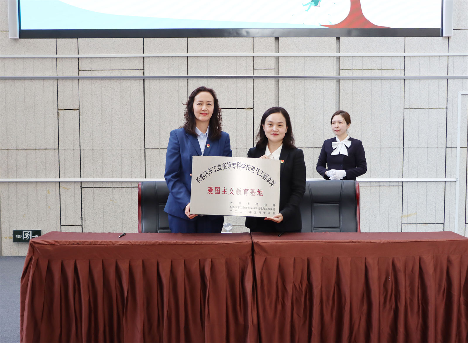 仪式上,颜丹丹、钱进代表校馆双方签约,共同为“长春汽车工业高等专科学校电气工程学院爱国主义教育基地”揭牌。