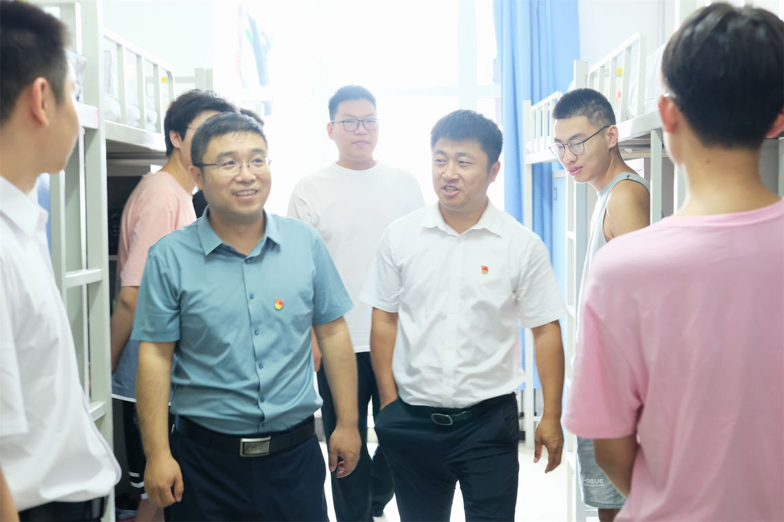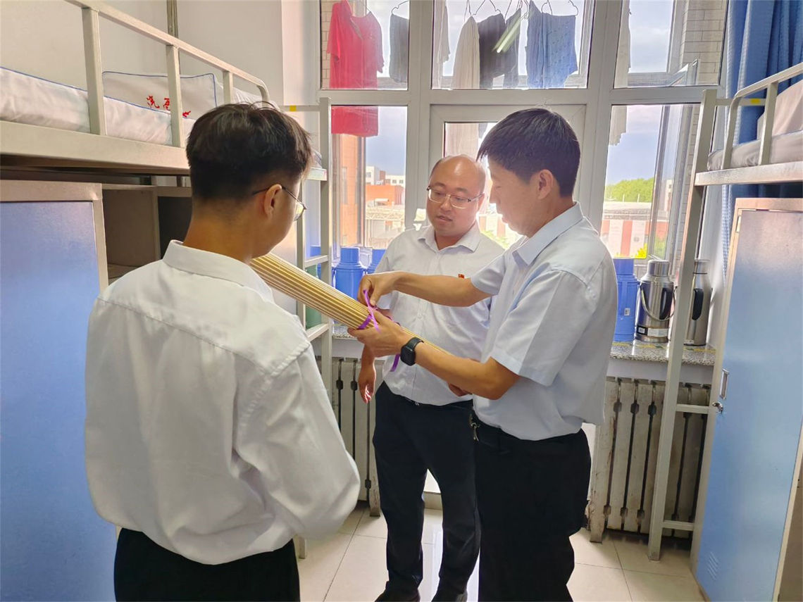 凉席分发完毕,领导及党员教师来到学生寝室进行走访慰问,帮助同学们将凉席铺好。小小的凉席不仅为同学们带来炎炎夏日里的一丝清凉,也传递了教师们的拳拳关爱之意。