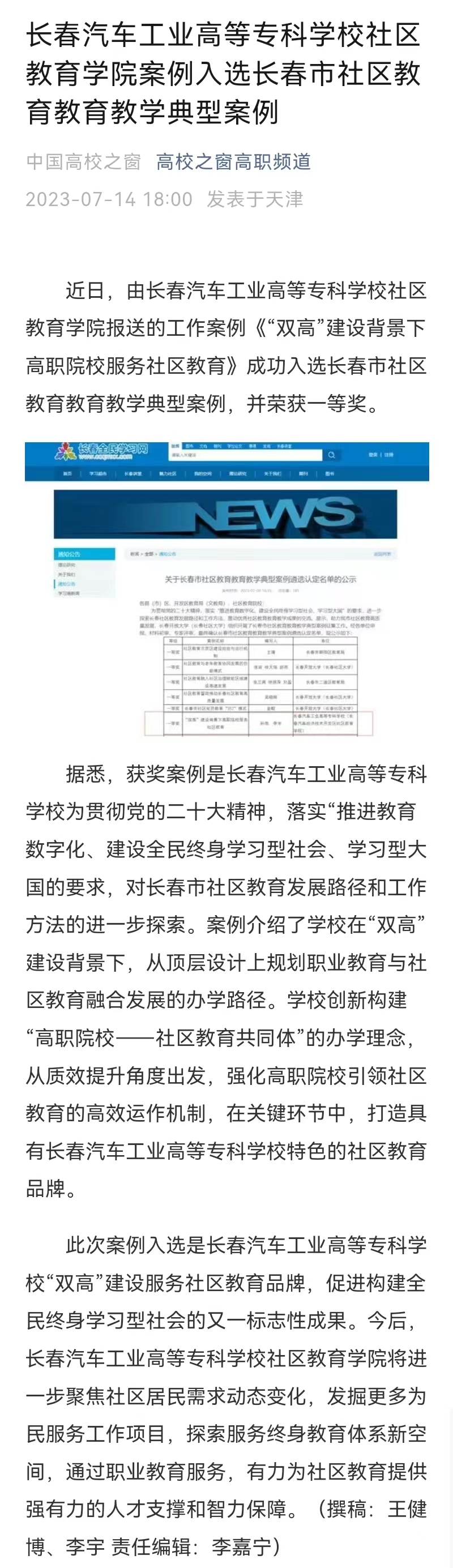 中国高校之窗——长春汽车工业高等专科学校社区教育学院案例入选长春市社区教育教育教学典型案例
