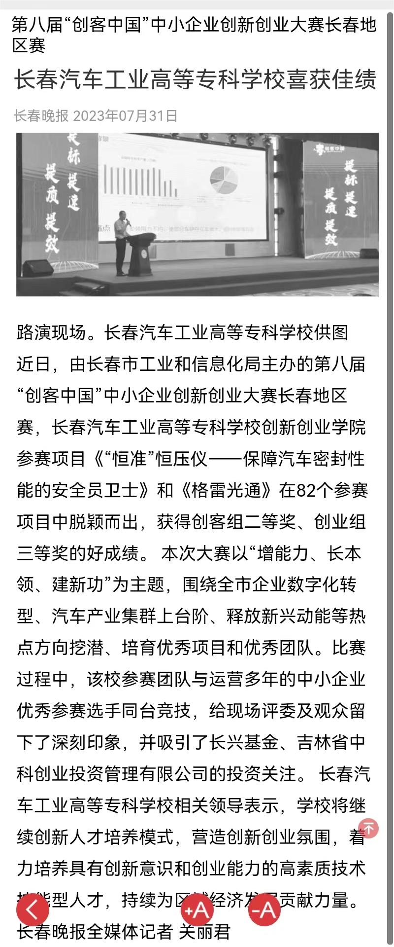 长春晚报——第八届“创客中国”中小企业创新创业大赛长春地区赛长春汽车工业高等专科学校喜获佳绩