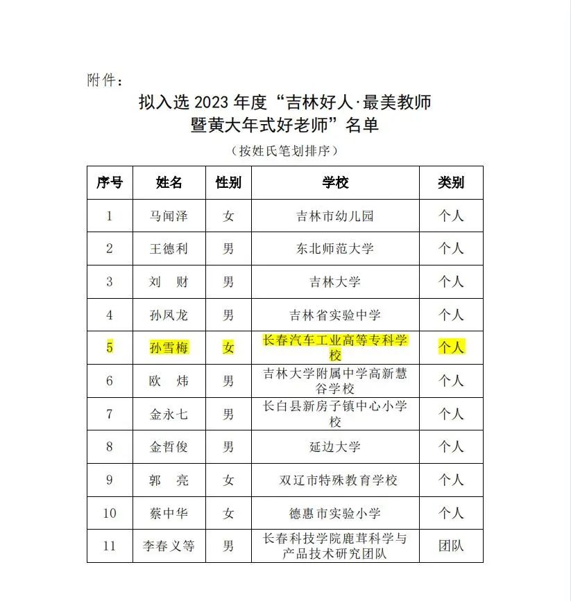 8月7日至8月11日,吉林省教育厅官网对拟入选2023年度“吉林好人•最美教师暨黄大年式好老师”进行公示,我校汽车运用学院教师孙雪梅光荣上榜。