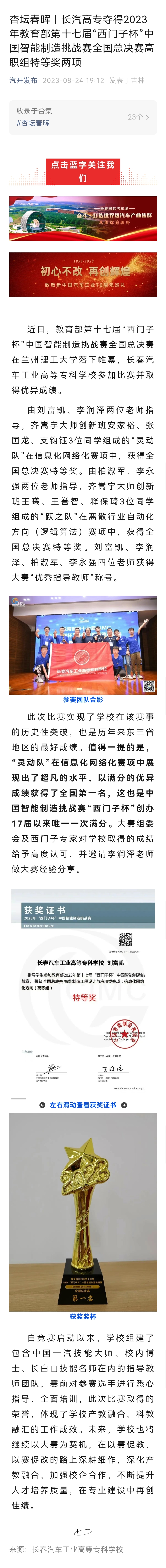 汽开发布——杏坛春晖丨长汽高专夺得2023年教育部第十七届“西门子杯”中国智能制造挑战赛全国总决赛高职组特等奖两项