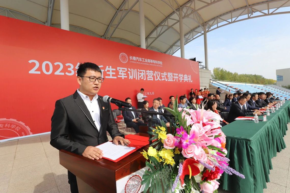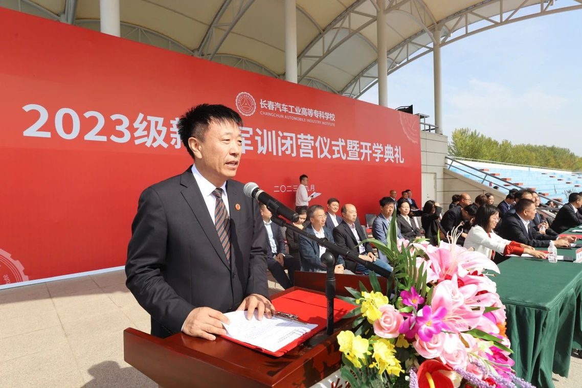 汽车工程学院2023级徐海涵同学代表新生发言。他表示,作为新时代职业院校大学生,既要有仰望星空的志向追求,又要有脚踏实地的奋斗韧劲,要用青春打好人生底色,用钻研造就工匠精神,做一名品学兼优的大学生。