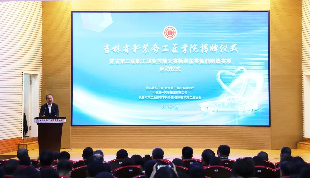 10月23日,吉林省新装备工匠学院揭牌仪式暨省第二届职工职业技能大赛新装备类智能制造赛项启动仪式在我校举行。吉林省人大常委会副主任、省总工会主席范锐平,中国一汽党委副书记王国强为吉林省新装备工匠学院和实训基地揭牌。吉林省总工会党组书记、常务副主席隋明利主持仪式。吉林省工业和信息化厅厅长宋刚、我校党委书记安军出席仪式。