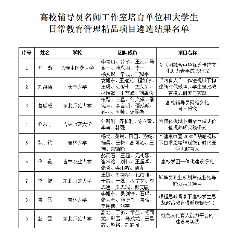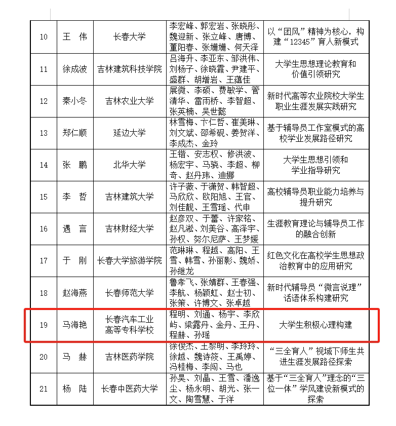 根据《关于开展高校辅导员名师工作室培育单位和大学生日常教育管理精品项目遴选工作的通知》(吉教思政〔2023〕13号)工作安排,经高校申报、专家评审,吉林省高校共21个团队(包括6个全国最美辅导员、全国辅导员年度人物团队)获评高校辅导员名师工作室培育单位和大学生日常教育管理精品项目。其中,我校马海艳工作室获评高校辅导员名师工作室培育单位。