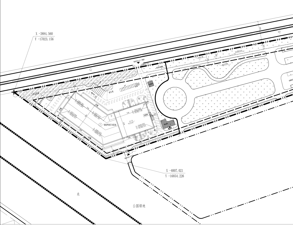 该项目建筑方案在规划上充分利用原有自然条件和地形地貌,尊重原有环境,因地制宜,尽量减少室外土方工程量,项目所在地块近似三角水滴型,建筑物为钝角V型建筑,建筑外部线条平直,为规则形状,和周边公建间距满足防护要求。建筑物位于整个校园的西北角,其所在地块与校园现址地块紧邻,所在地块东侧为车路协同区,南侧为校园既有校区。建筑物周围设有环形道路,可满足园区内交通使用和消防扑救。
