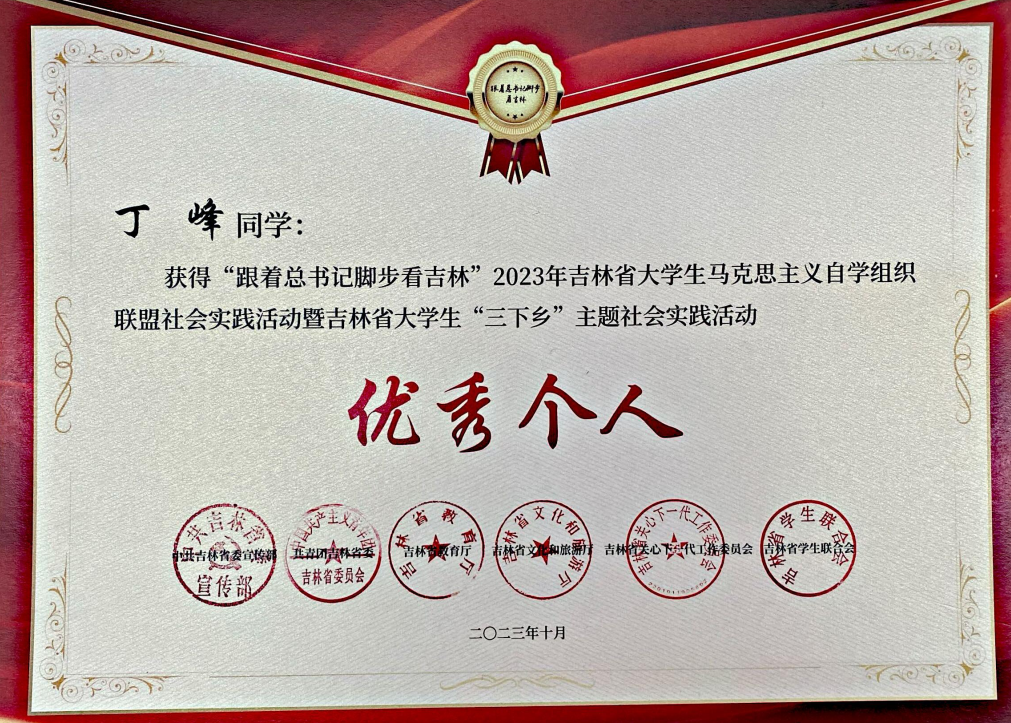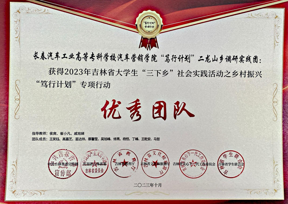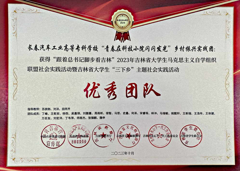 近日,中共吉林省委宣传部、共青团吉林省委、吉林省教育厅、吉林省文化和旅游厅、吉林省关心下一代工作委员会、吉林省学生联合会联合下发《关于表扬“跟着总书记脚步看吉林”2023年吉林省大学生马克思主义自学组织联盟社会实践活动暨吉林省大学生“三下乡”主题社会实践活动优秀工作典型的通知》(吉团联字〔2023〕32 号),我校荣获“优秀单位”荣誉称号,校学联学生会“青春在科技小院闪闪发光”乡村振兴实践团荣获“优秀团队”荣誉称号,汽车营销学院“凡尚耕村”二龙乡调研团荣获吉林省大学生“三下乡”之乡村振兴“笃行计划”专项行动“优秀团队”荣誉称号,汽车工程学院新能源汽车技术专业2022级校团委兼职副书记丁峰荣获“优秀个人”荣誉称号。