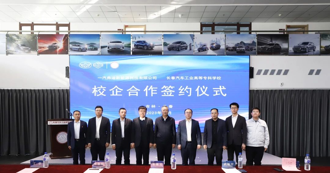 为进一步深化校企合作,发挥高校与企业双方优势,助力新能源汽车产业发展,2023年12月29日下午,我校与一汽弗迪新能源科技有限公司(以下简称“一汽弗迪”)校企合作项目签约仪式顺利举行。长春市教育局党组成员、长春市政府教育督导室专职督学张德文,一汽弗迪总经理武瑞甲、运营总监曹义、人事经理夏鑫、装备部经理刘洋,我校党委副书记、校长李春明,副校长丁卓、王海阳出席仪式,双方教师代表及联合培养班的62位同学参加仪式。签约仪式由我校副校长张勇忠主持。